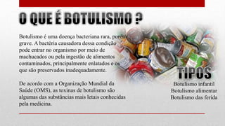O documento discute o botulismo, uma doença rara mas grave causada pela bactéria Clostridium botulinum. Existem três tipos principais: botulismo infantil causado por ingestão de alimentos contaminados por bebês, botulismo alimentar pela ingestão de alimentos em conserva contaminados, e botulismo de feridas quando esporos entram no corpo por meio de lesões na pele. O documento descreve os sintomas e tratamento para cada tipo.