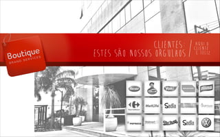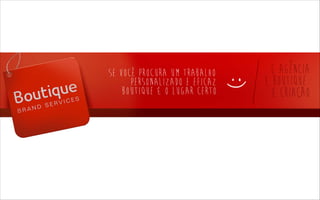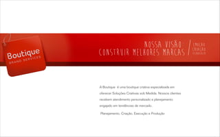 A Boutique oferece soluções criativas sob medida para desenvolver marcas fascinantes através de comunicação inovadora, como planejamento estratégico, criação, execução e produção de campanhas de marketing que movam os consumidores e tornem as marcas emocionais e economicamente bem-sucedidas.