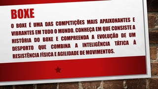 O documento descreve a história do boxe, desde suas origens na Grécia Antiga até seu desenvolvimento como esporte moderno. Detalha como o boxe era praticado na Antiguidade e como as regras foram estabelecidas no século XVII pelo Marquês de Queensberry para torná-lo menos violento. Também aborda a popularização do boxe no século XX e a chegada deste esporte no Brasil.