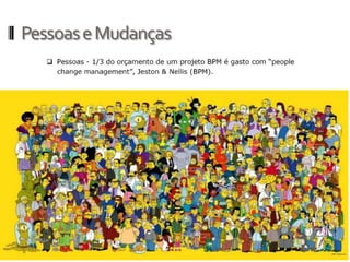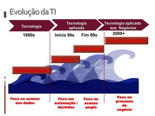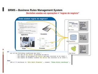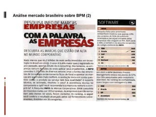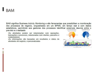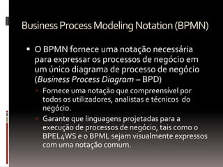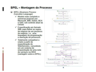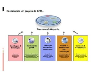O documento discute conceitos, tecnologias e aplicações de gerenciamento de processos de negócio (BPM). Ele explica que BPM envolve mapear processos de negócio e automatizá-los através de tecnologia para melhorar o acesso a dados e a tomada de decisões. Também fornece um exemplo de como BPM pode ser usado para orquestrar processos em uma polícia militar.