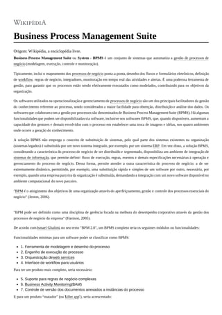 Um Business Process Management Suite (BPMS) é um conjunto de sistemas que automatiza a gestão dos processos de negócio, incluindo modelagem, execução, controle e monitoramento destes processos. Um BPMS típico mapeia processos de ponta a ponta, define fluxos e formulários eletrônicos e monitora atividades em tempo real com alertas. Um BPMS permite integrar sistemas de informação existentes e definir fluxos, regras e especificações para gerenciar processos de forma dinâmica.
