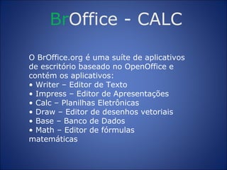 O documento descreve as principais funções do aplicativo Calc do BrOffice, uma suíte de escritório livre e de código aberto. O Calc permite criar e editar planilhas eletrônicas, trabalhando com células, colunas, linhas e endereços. A tela inicial do Calc exibe a barra de fórmulas, a planilha e as guias de planilhas. A barra de formatação oferece opções para formatar texto, números, células e planilhas.
