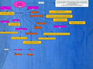 O documento descreve as características do estilo Barroco na arquitetura, pintura e escultura, com ênfase no Barroco em Braga. Apresenta exemplos como o Arco da Porta Nova, o Palácio do Raio e a escultura do Bom Jesus como representações da arquitetura e escultura Barrocas na cidade.