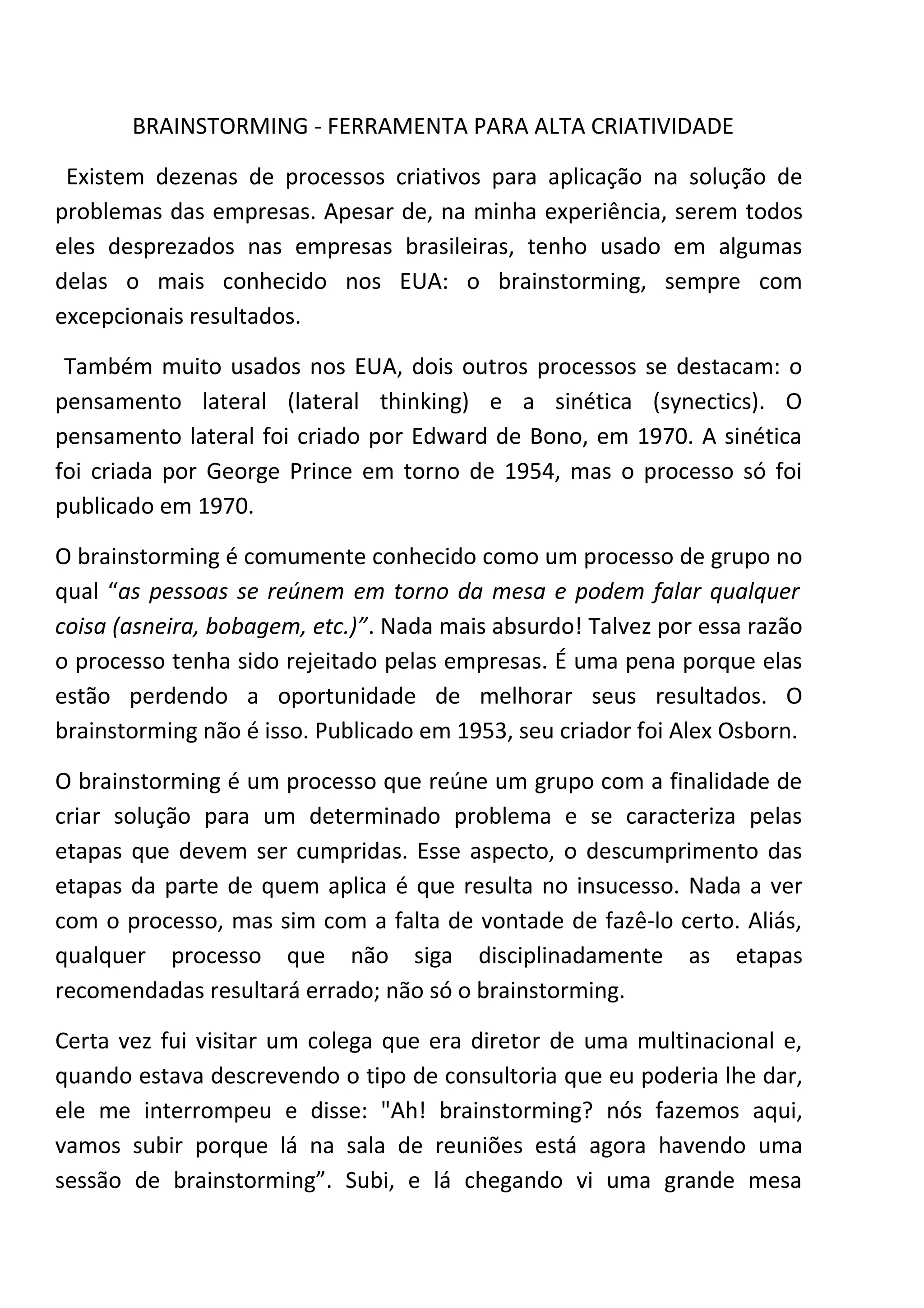O documento descreve o processo de brainstorming como uma ferramenta para alta criatividade nas empresas. Ele explica que o brainstorming envolve reuniões de grupo para gerar soluções para problemas seguindo etapas específicas como orientação, preparação, ideação e avaliação. O documento também destaca que o brainstorming, quando aplicado corretamente, trás benefícios como redução de custos e aumento da qualidade e inovação.