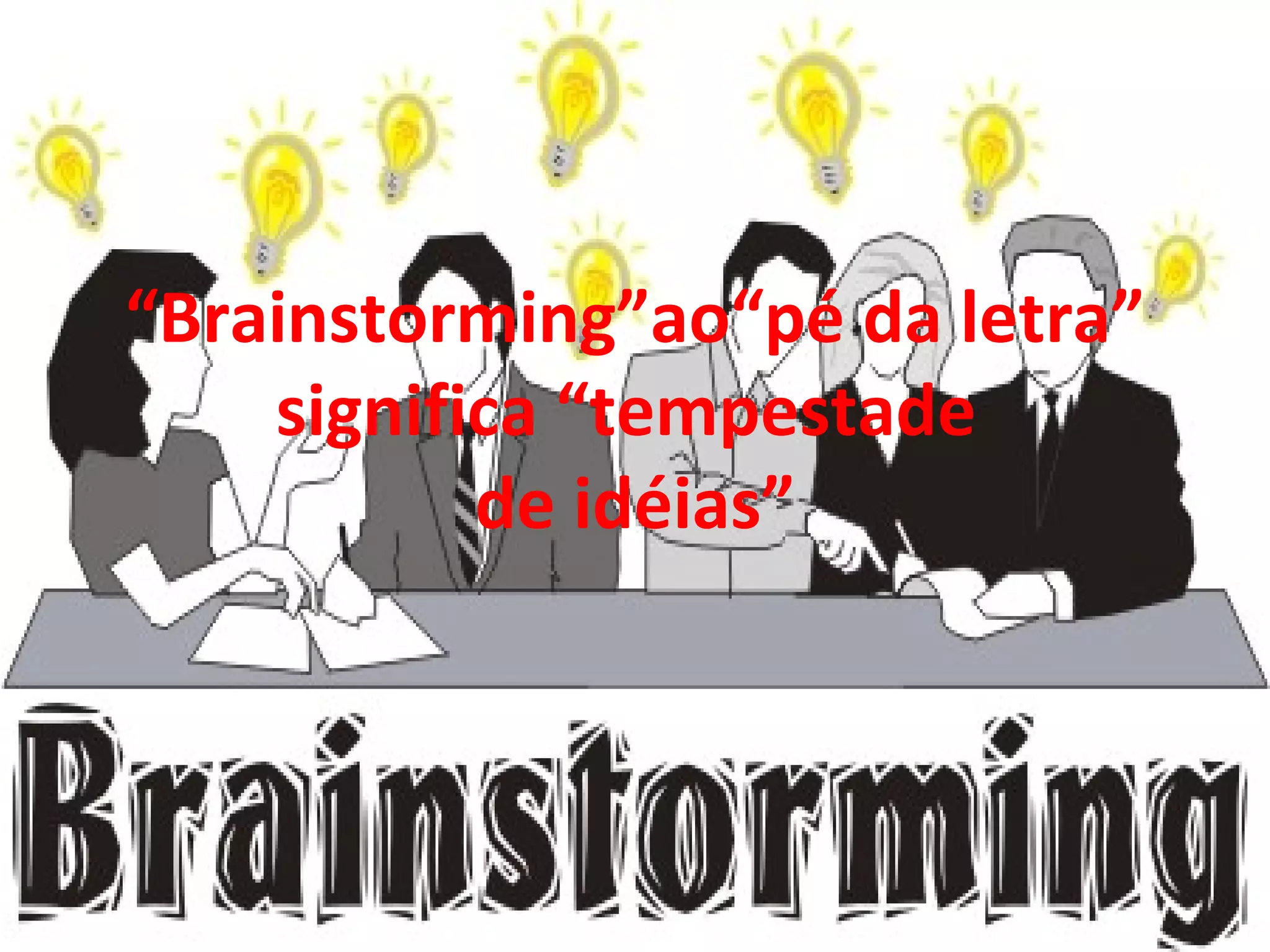 O documento descreve as etapas do processo de brainstorming: orientação, onde o coordenador apresenta o problema; preparação, com a alocação de tempo para geração de ideias; ideação, fase de associação e escolha das melhores ideias; e resultados, com diversidade de soluções geradas.