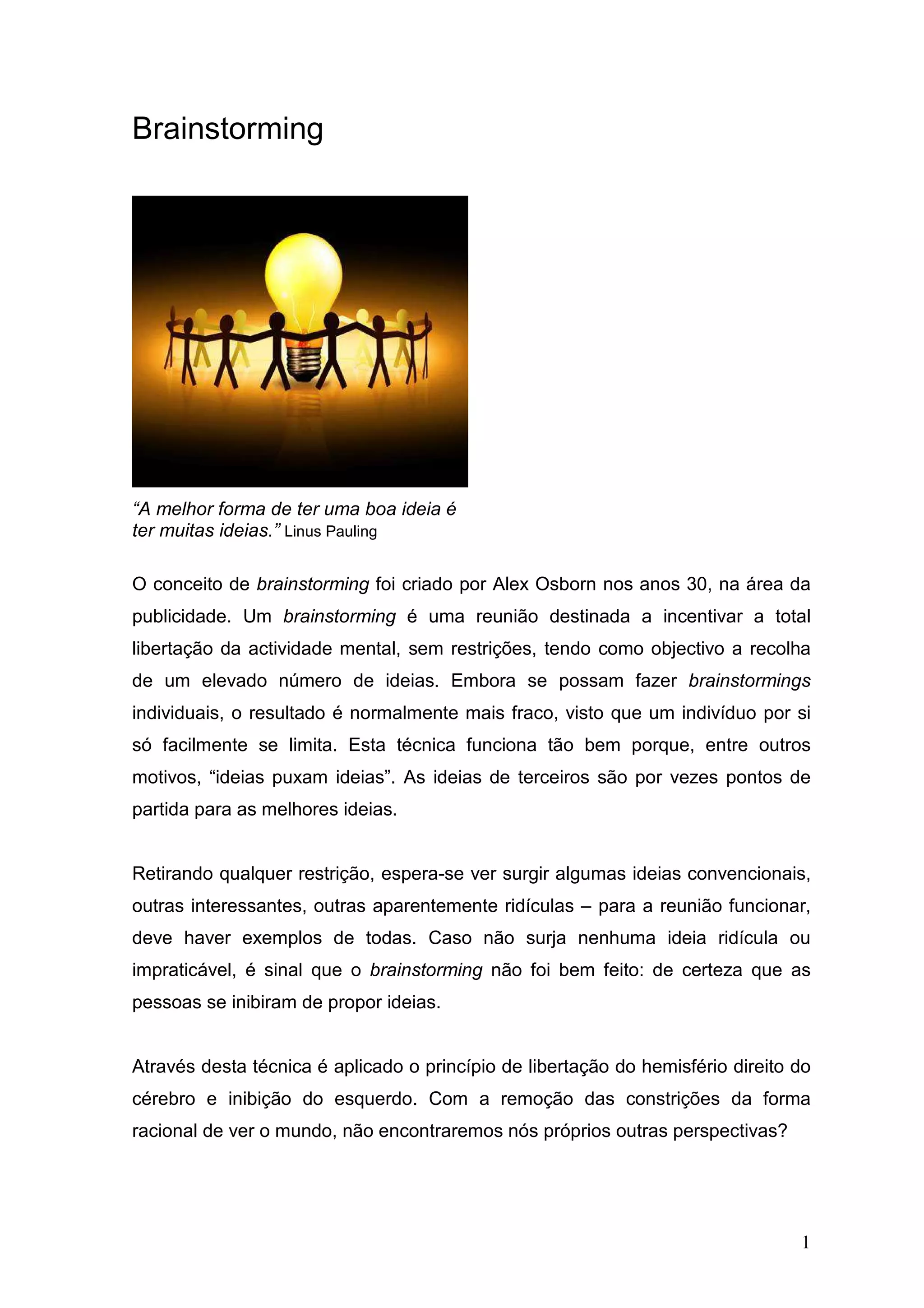 O documento descreve a técnica de brainstorming, definida como uma reunião para gerar um grande número de ideias sem restrições. Explica que embora possa ser feito individualmente, em grupo é mais eficaz, e destaca a importância de um ambiente de liberdade e variedade de ideias, mesmo as aparentemente ridículas. Também fornece várias técnicas para induzir a geração de ideias durante o brainstorming.