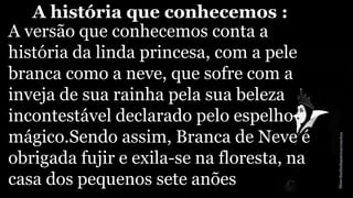 A história de Branca de Neve pode ter sido inspirada em eventos reais de uma princesa chamada Margarete von Waldeck, que foi possivelmente envenenada por sua madrasta. Os sete anões representavam crianças que trabalhavam nas minas. Versões mais macabras da história dizem que a mãe, não a madrasta, tentou matar Branca de Neve, e que a bruxa queria mais do que apenas o coração da princesa.