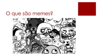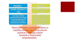 O documento discute a teoria dos memes proposta por Richard Dawkins na década de 1970. Dawkins sugeriu que assim como os genes se espalham entre os organismos, as ideias se espalham entre as pessoas através de um processo de imitação, que ele chamou de "vírus da mente". O documento explora como os memes se comportam e evoluem na mente humana, influenciando o pensamento e o comportamento das pessoas.
