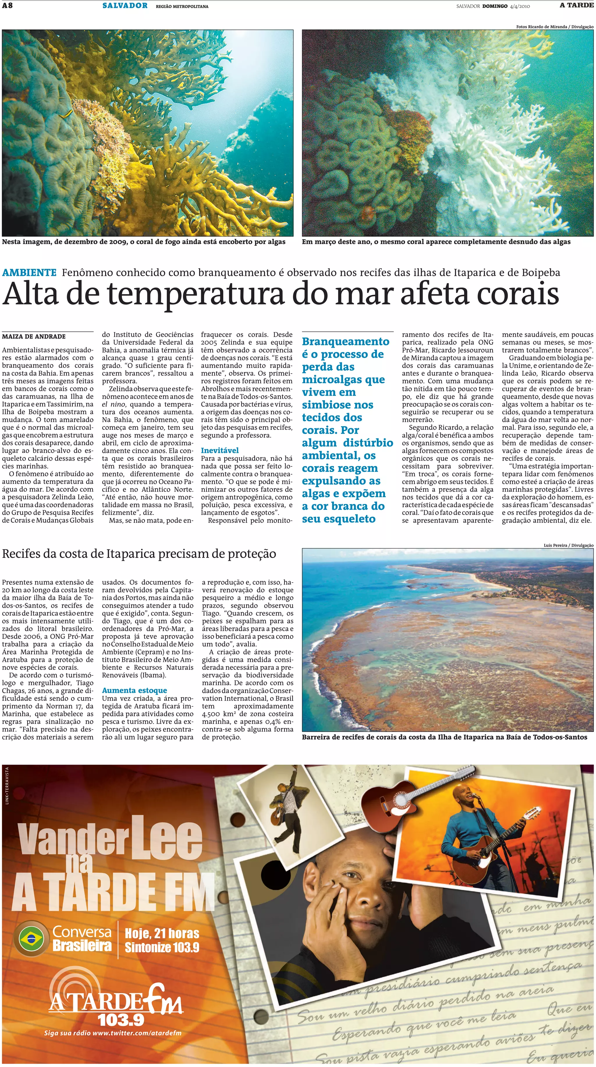 Branqueamento de corais está ocorrendo rapidamente na costa da Bahia devido ao aumento da temperatura da água do mar, fazendo com que as algas vivas nos corais sejam expulsas. Isso pode prejudicar a recuperação dos corais caso a temperatura não volte ao normal. A criação de áreas marinhas protegidas pode ajudar a conservar os recifes de corais.