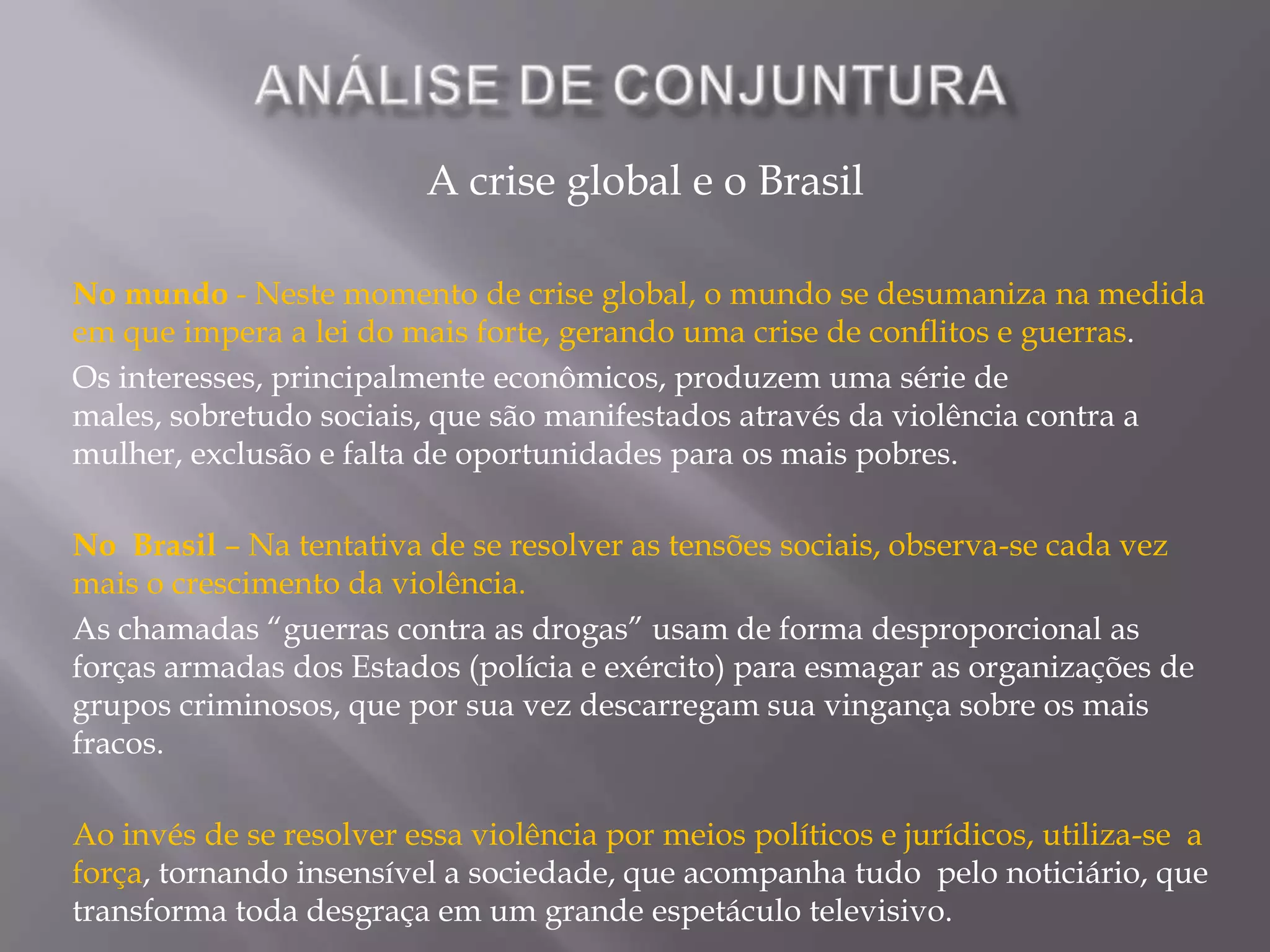 O documento discute a violência crescente no Brasil em resposta às tensões sociais e o uso desproporcional da força policial e militar contra grupos criminosos. Também destaca a importância dos movimentos sociais e das pastorais sociais da Igreja como alternativas viáveis com experiência em propostas de políticas públicas. Por fim, analisa a situação da comunidade do Grajaú, local periférico de São Paulo com alta taxa de homicídios entre jovens e falta de equipamentos públicos para eles.