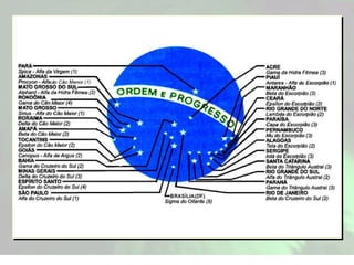 O documento resume a história das bandeiras nacionais do Brasil desde a Bandeira de Ordem de Cristo em 1332 até a bandeira atual adotada em 1889. Discorre sobre os significados históricos e simbólicos dos elementos presentes na bandeira atual, como as cores, a esfera celeste e as estrelas representativas dos estados brasileiros.