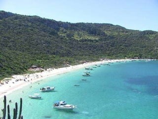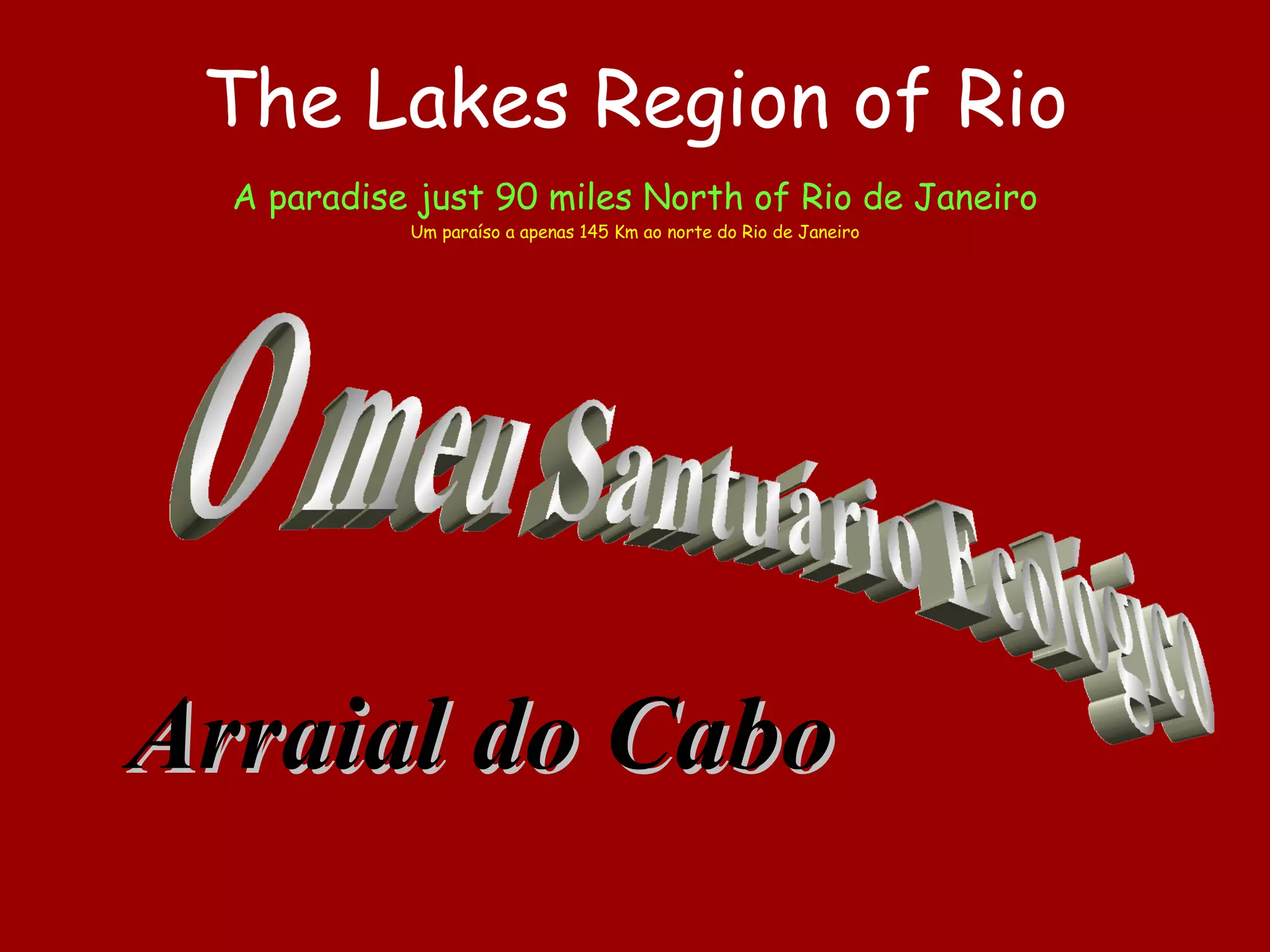O documento descreve a Região dos Lagos no estado do Rio de Janeiro, Brasil. A região se estende por 96 km e inclui praias de águas cristalinas e lagoas de água salgada ao norte da cidade do Rio de Janeiro. O documento fornece detalhes e fotos da cidade de Arraial do Cabo nesta região, incluindo suas praias, grutas e pontos turísticos.
