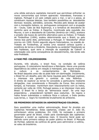 O documento resume a história do Brasil Colônia, abordando tópicos como a colonização portuguesa, a economia baseada na cana-de-açúcar e na escravidão, a resistência negra representada por quilombos como Palmares, e o breve domínio espanhol sobre o território durante a união dinástica entre Portugal e Espanha.