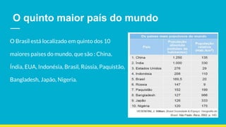 O Brasil é o quinto maior país do mundo em tamanho e caiu para a 81a posição no ranking de competitividade econômica global. A violência no Brasil é alta, com o país tendo a maior taxa de homicídios no mundo. O Brasil mantém uma área territorial de 8,515,767 km2.