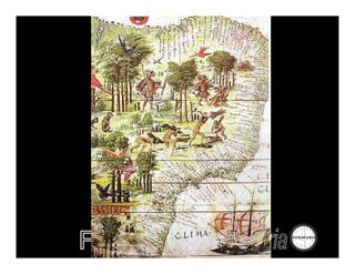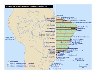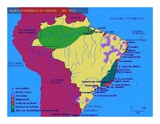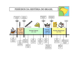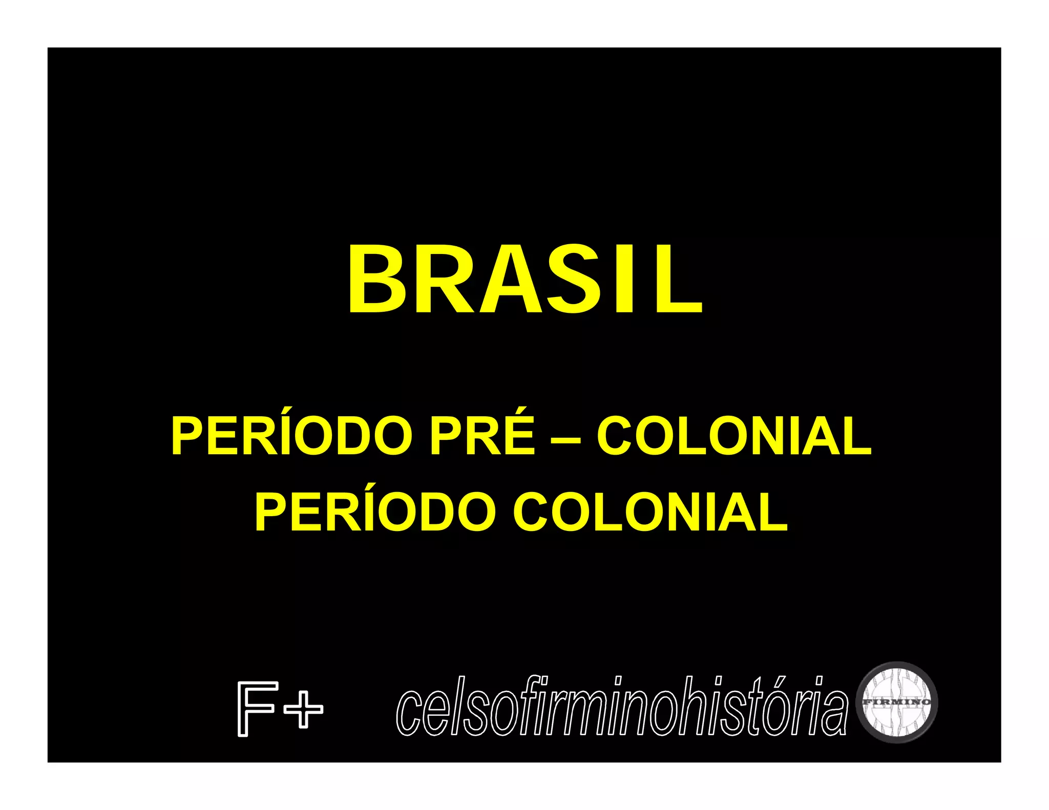 O documento resume a história do Brasil no período pré-colonial e colonial, desde o tratado entre Portugal e Espanha em 1493 até a independência em 1822. No período pré-colonial, Portugal explorou economicamente o Brasil através da extração de pau-brasil, comércio de escravos indígenas e estabelecimento de feitorias. No período colonial, Portugal colonizou oficialmente o Brasil a partir de 1530 visando ocupar terras e encontrar metais preciosos, estruturando a economia em torno da agricult