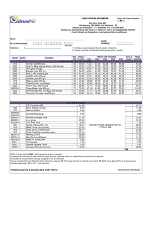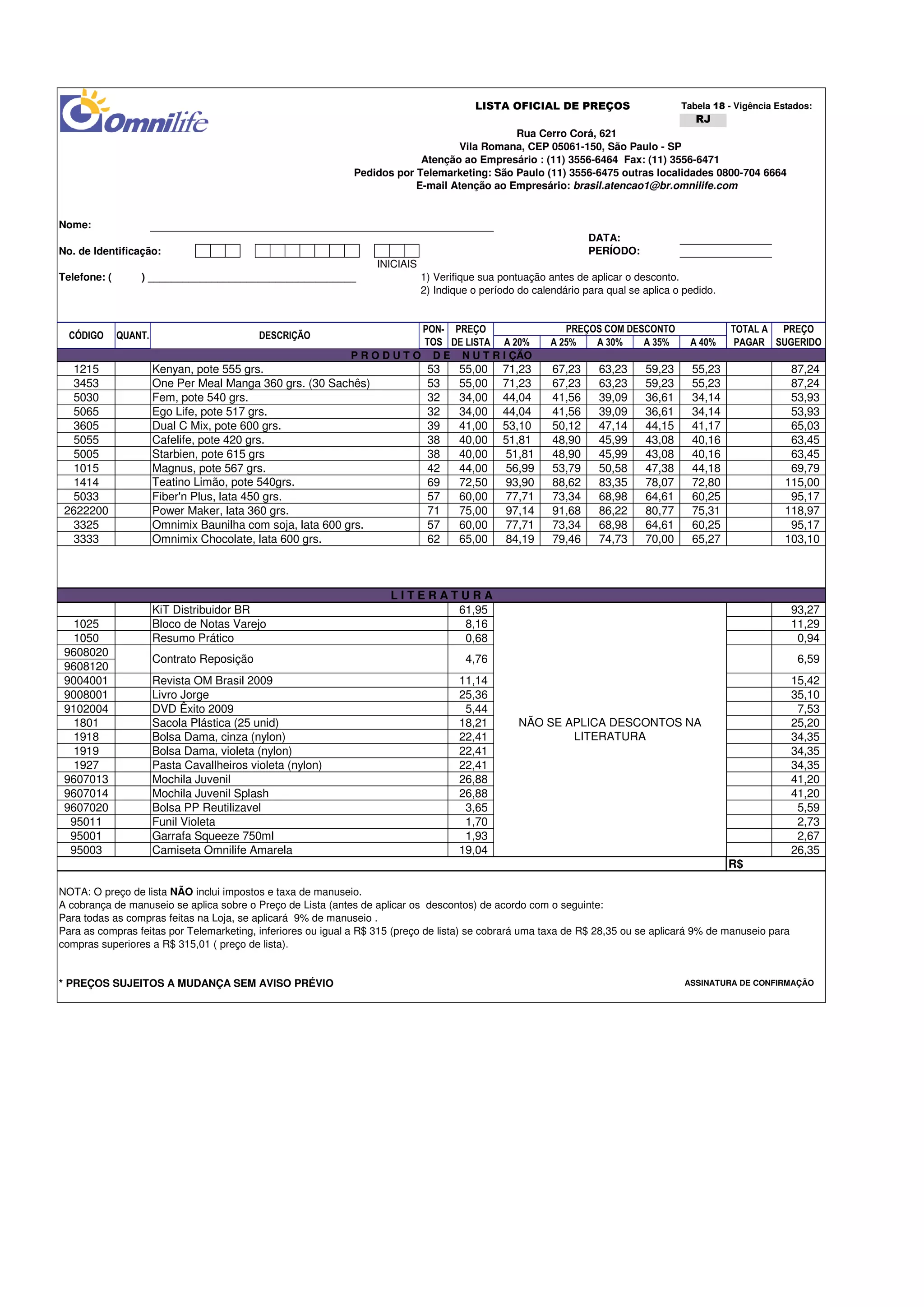 Este documento é uma lista de preços oficial de produtos de nutrição e literatura da Omnilife com seus respectivos códigos, quantidades, descrições, pontos, preços de lista e preços com descontos de 20% a 40%. A nota final informa que os preços não incluem impostos e taxa de manuseio de 9% sobre o preço de lista para compras na loja ou taxa fixa de R$28,35 para compras por telemarketing abaixo de R$315.