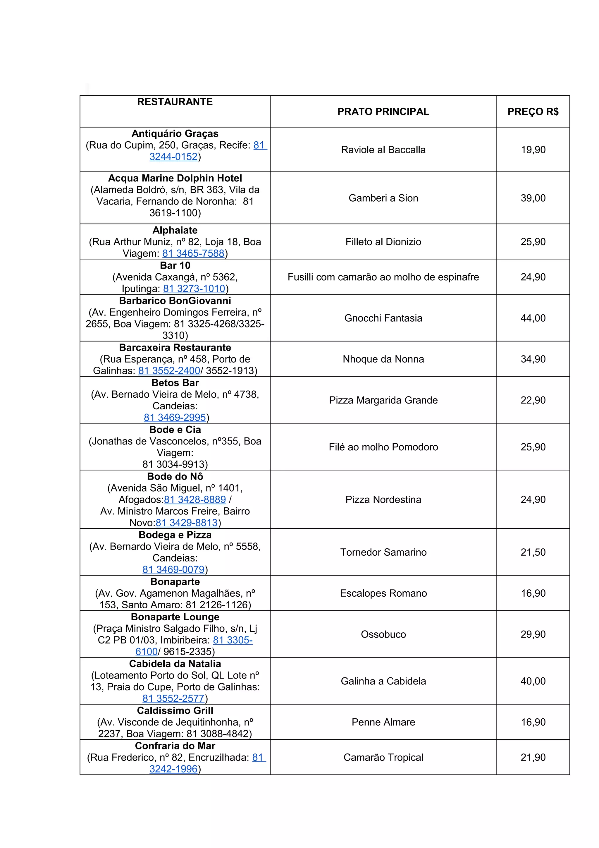 O documento lista os pratos principais e seus preços de 15 restaurantes diferentes localizados em várias cidades de Pernambuco. Os preços variam de R$9,90 a R$44,00, com a maioria entre R$15-30. Há opções de frutos do mar, massas, carnes e pizzas.