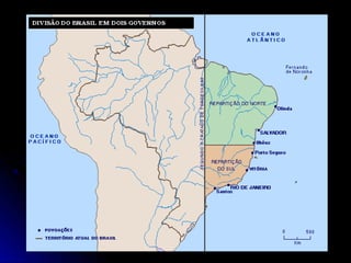 Após a chegada de Cabral ao Brasil em 1500, a tomada de posse portuguesa foi gradual através de expedições exploratórias e militares para combater contrabandistas estrangeiros e garantir o monopólio do pau-brasil. O sistema de capitanias hereditárias fracassou devido aos ataques indígenas, falta de apoio de Portugal e falência dos donatários, levando à criação dos governos gerais em 1548. A União Ibérica de 1580 a 1640 resultou na invasão holandesa do Brasil e em con