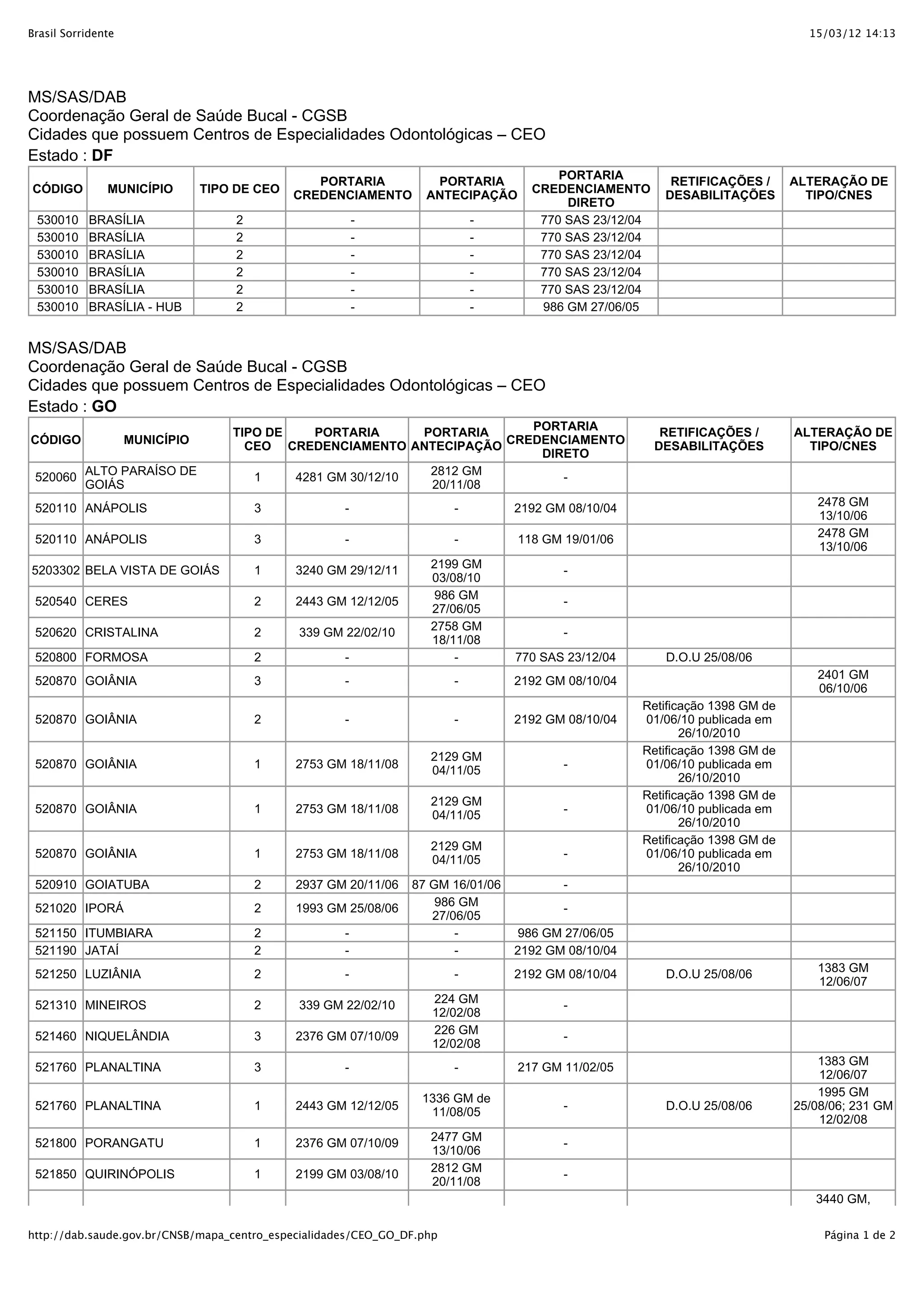 Este documento lista as cidades brasileiras nos estados de Goiás e Distrito Federal que possuem Centros de Especialidades Odontológicas (CEO), incluindo o código da cidade, nome, tipo de CEO, portarias de credenciamento e alterações. As informações estão organizadas em tabelas por estado.