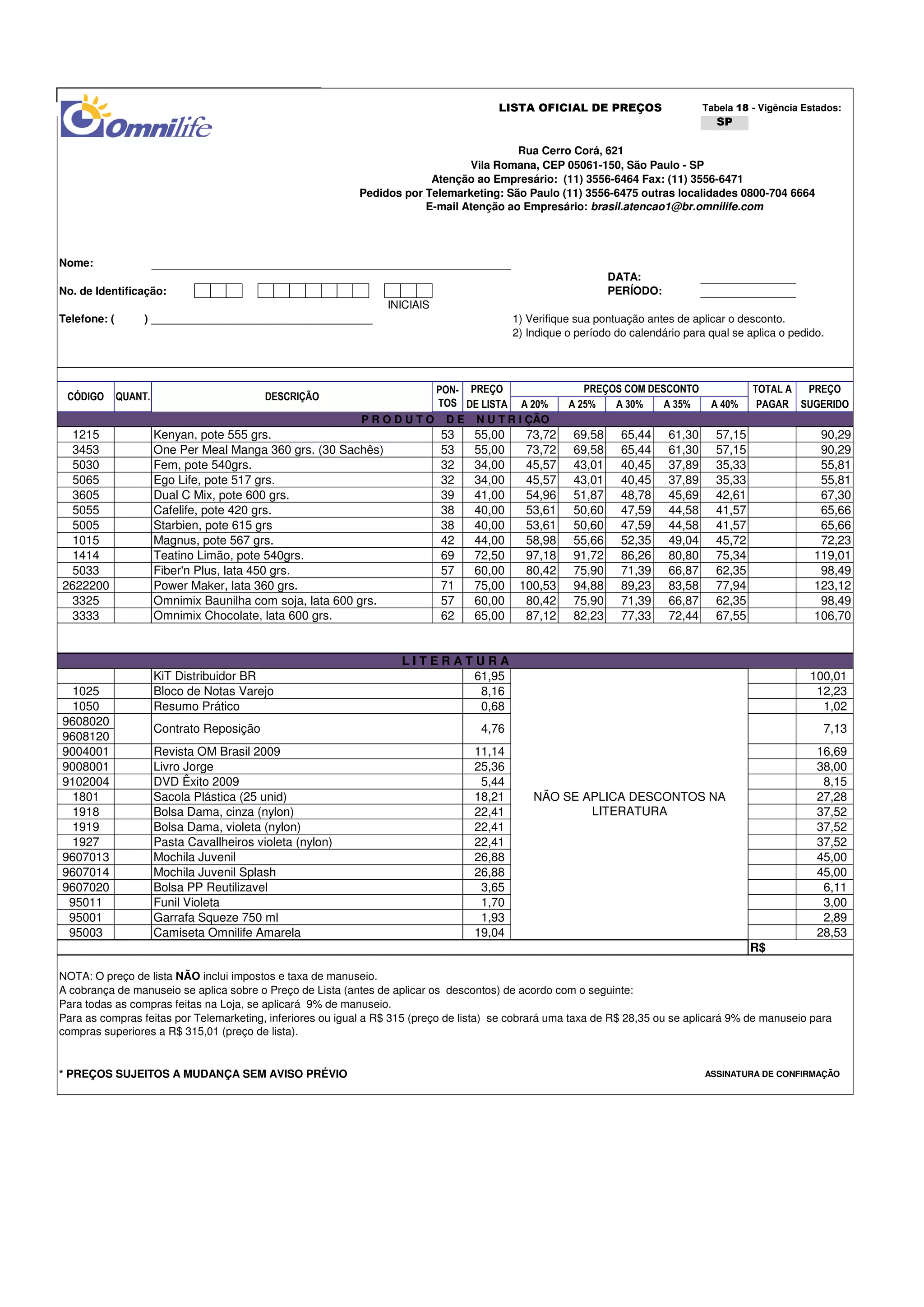 1) Lista oficial de preços de produtos de nutrição e literatura da Omnilife com códigos, descrições, quantidades, pontos, e preços de lista e com descontos de 20% a 40%.