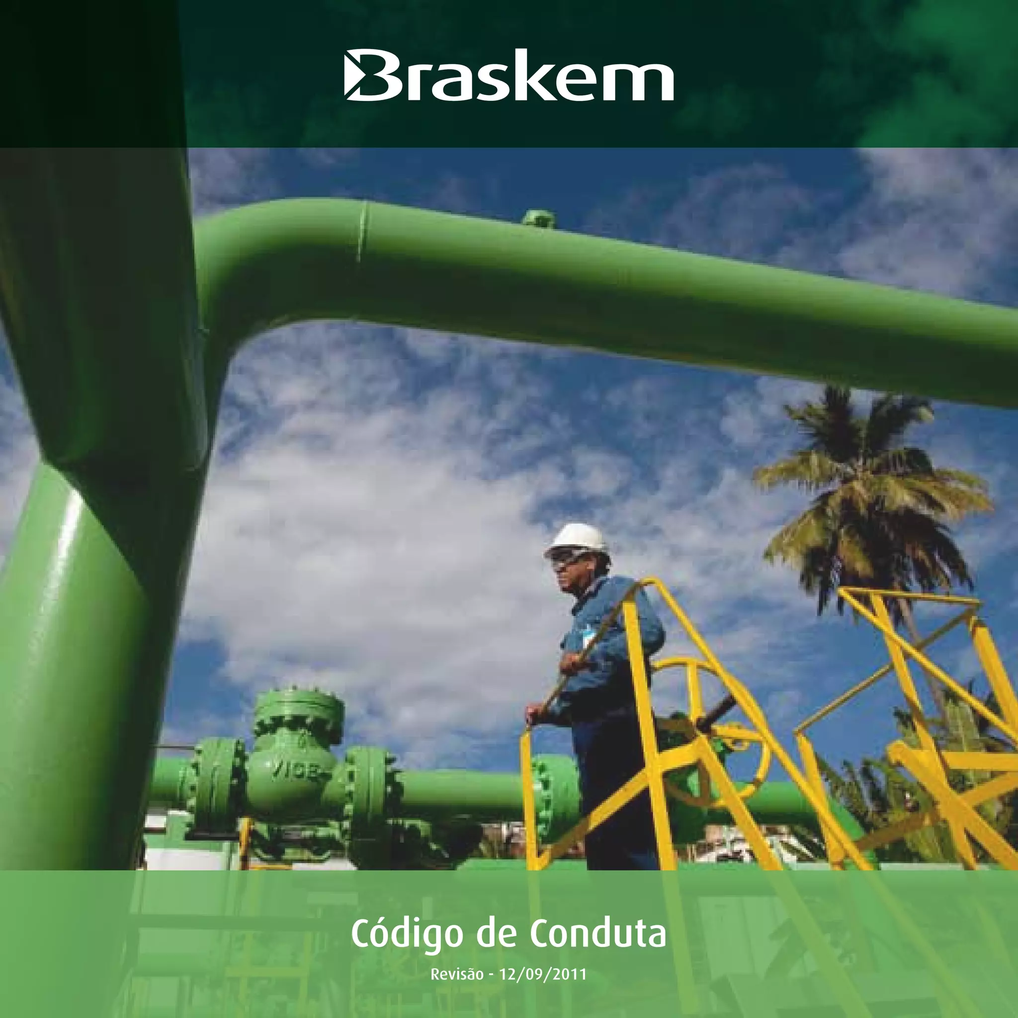 Este documento apresenta o Código de Conduta da BRASKEM, estabelecendo princípios éticos e normas de conduta para as relações internas e externas da empresa. Ele aborda tópicos como relacionamento com clientes, fornecedores, concorrentes e o poder público, além de conflitos de interesse, meio ambiente e responsabilidade social. O objetivo é orientar os integrantes da BRASKEM a agirem com integridade, respeito e transparência em todas as suas atividades.