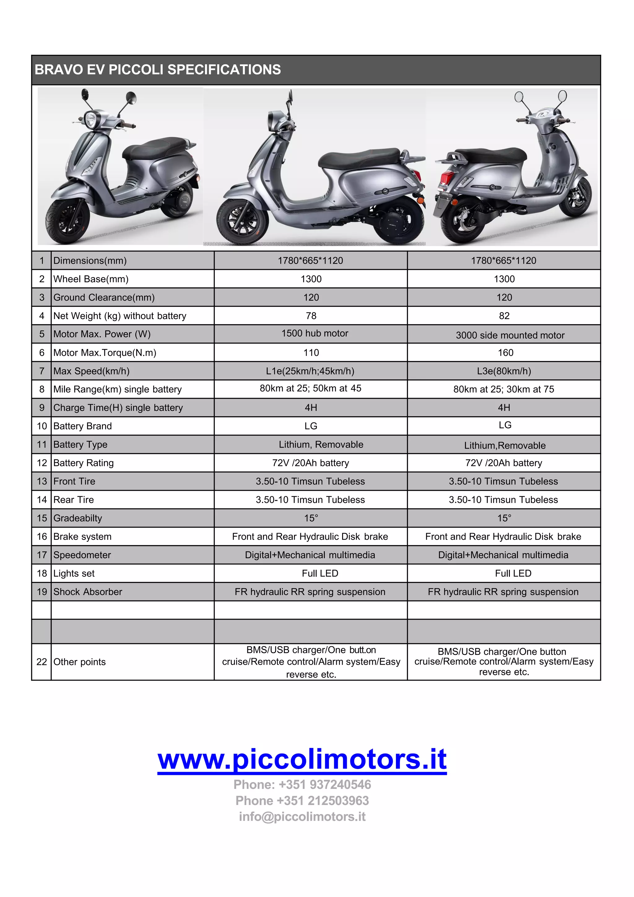 O documento fornece especificações técnicas de dois modelos de veículos elétricos da Bravo EV Piccoli, incluindo suas dimensões, autonomia, bateria, motor e outros detalhes técnicos como freios, suspensão e iluminação.