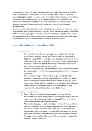 2) Embora haja alguns esforços do governo para combater a pirataria, mais ações são necessárias, como aumentar a cooperação com provedores de internet e aplicar penalidades mais severas.