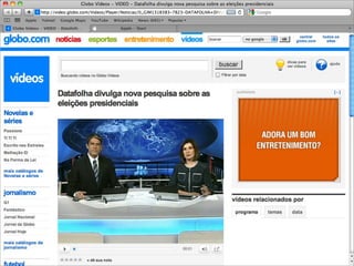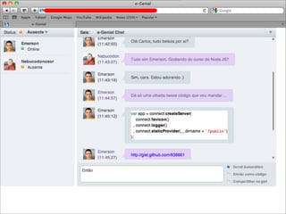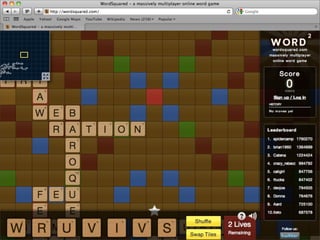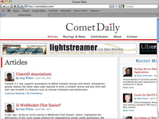 O documento discute as tecnologias e práticas que permitem aplicações web em tempo real, onde os usuários recebem informações assim que são publicadas pelos autores, ao invés de precisar checar periodicamente por atualizações. Comet, WebSockets e FlashSocket são abordados como possíveis soluções para permitir comunicação em tempo real na web. A implementação de aplicações reais em tempo real na prática é desafiadora devido às limitações iniciais da web.