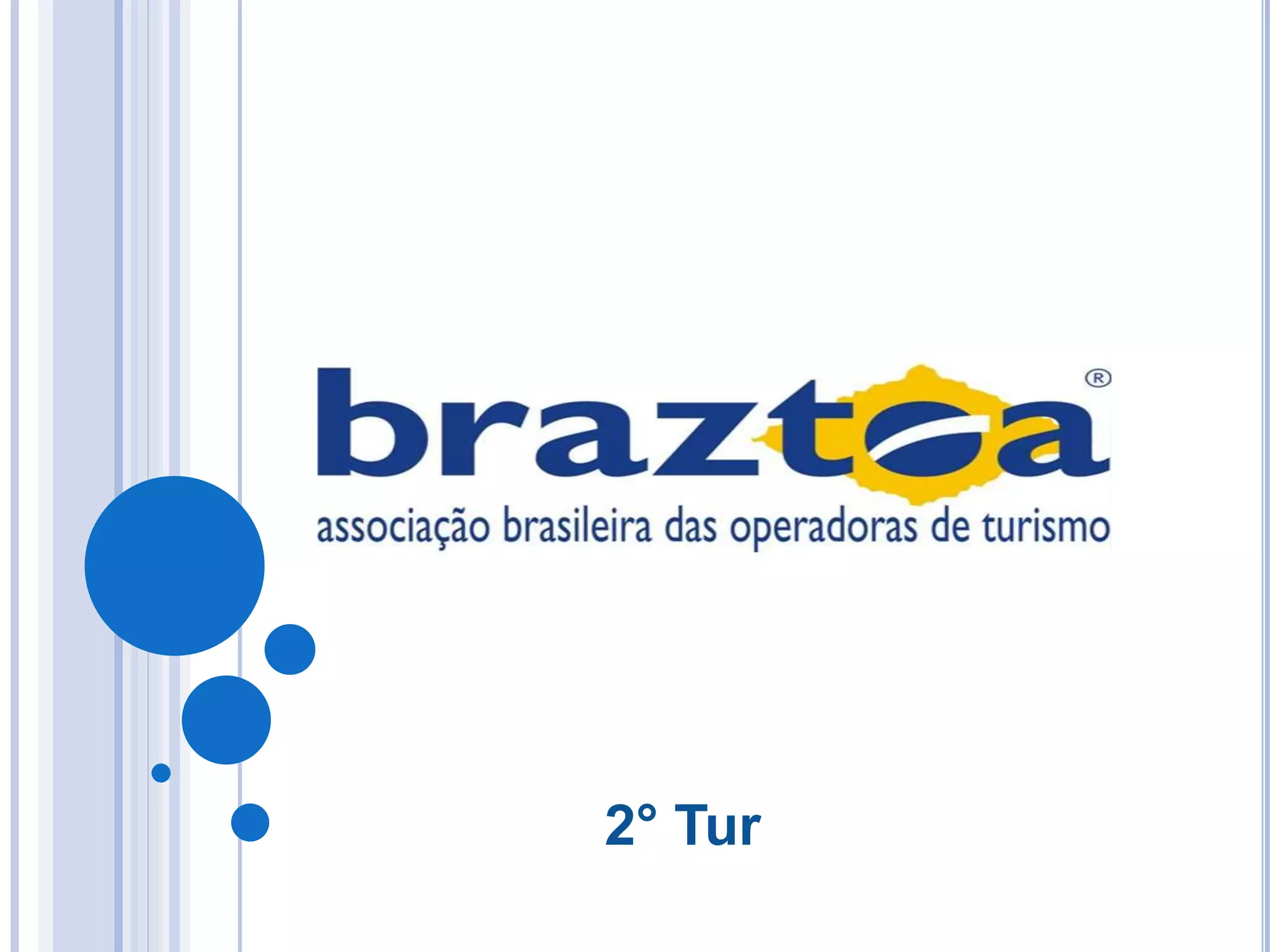 A BRAZTOA foi fundada em 1994 através da união das entidades COBRAT e BRAZTOA para fortalecer as operações turísticas brasileiras. Sua missão é promover ações e parcerias que valorizem os associados e apoiem o desenvolvimento sustentável do mercado turístico. Seus objetivos incluem representar os interesses dos associados e promover o aperfeiçoamento das relações entre associados, agências de viagens e fornecedores.