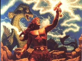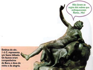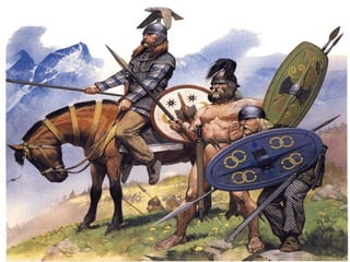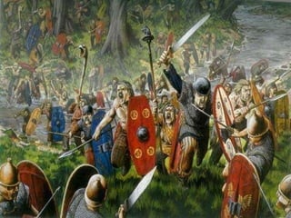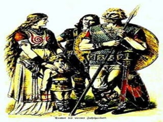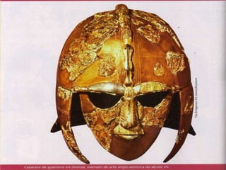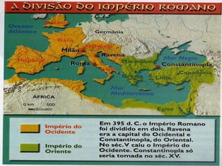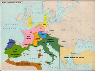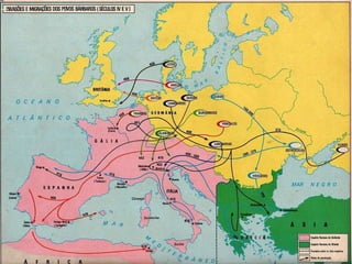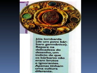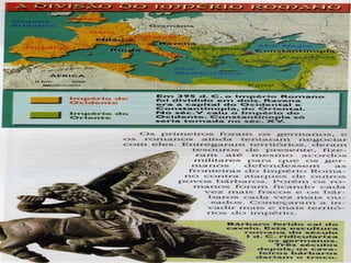 O documento descreve as causas da queda do Império Romano, incluindo invasões bárbaras. Detalha os principais grupos bárbaros como os germânicos (vândalos, visigodos etc) e eslavos. Discutem as instituições políticas e sociedade dos bárbaros, sua religião politeísta e economia agrícola. Finalmente, explica as consequências das invasões bárbaras no Império Romano, como a descentralização do poder e regressão cultural.