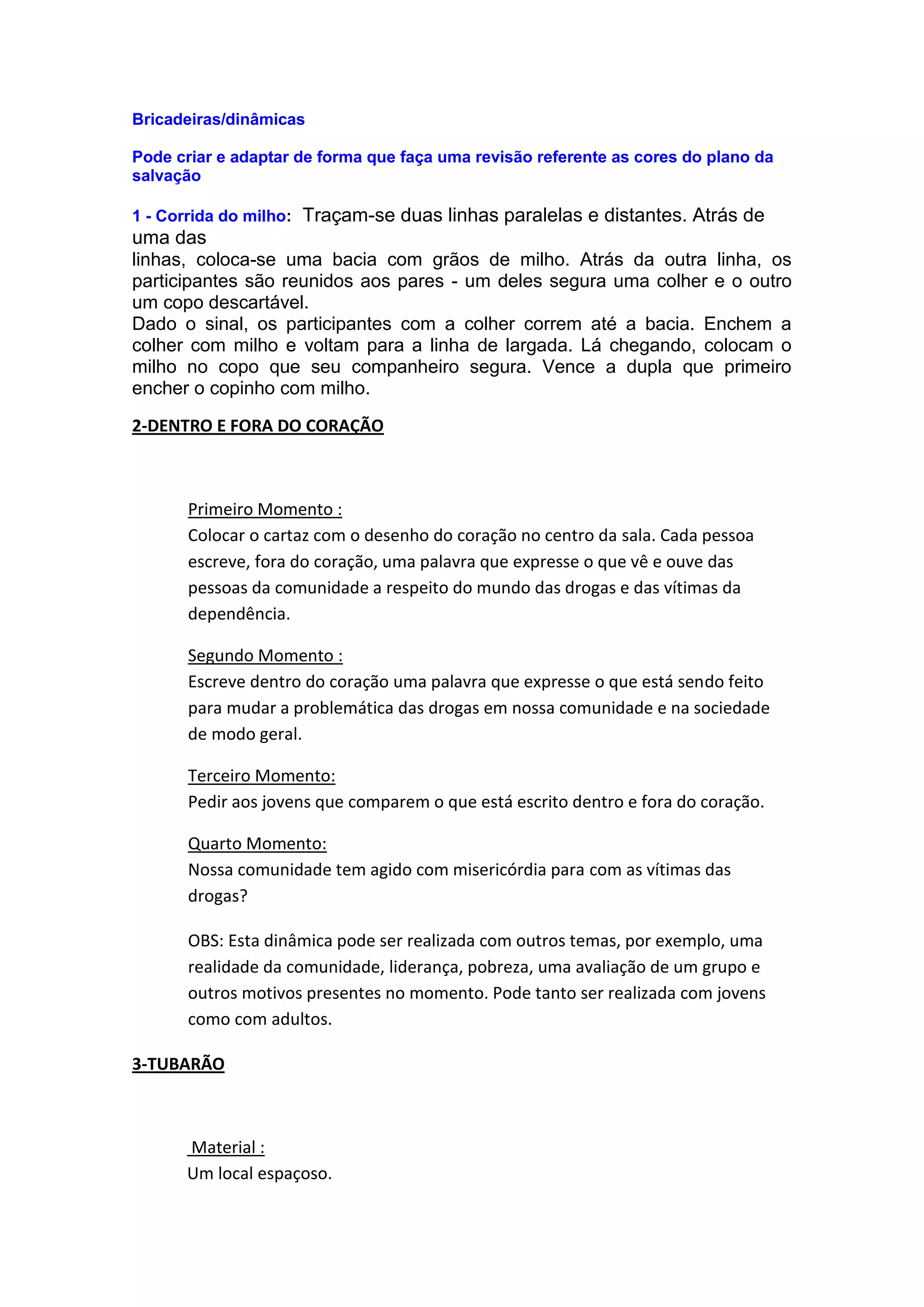1) As dinâmicas propõem atividades lúdicas para revisar as cores do plano de salvação, como corridas e jogos em grupo.