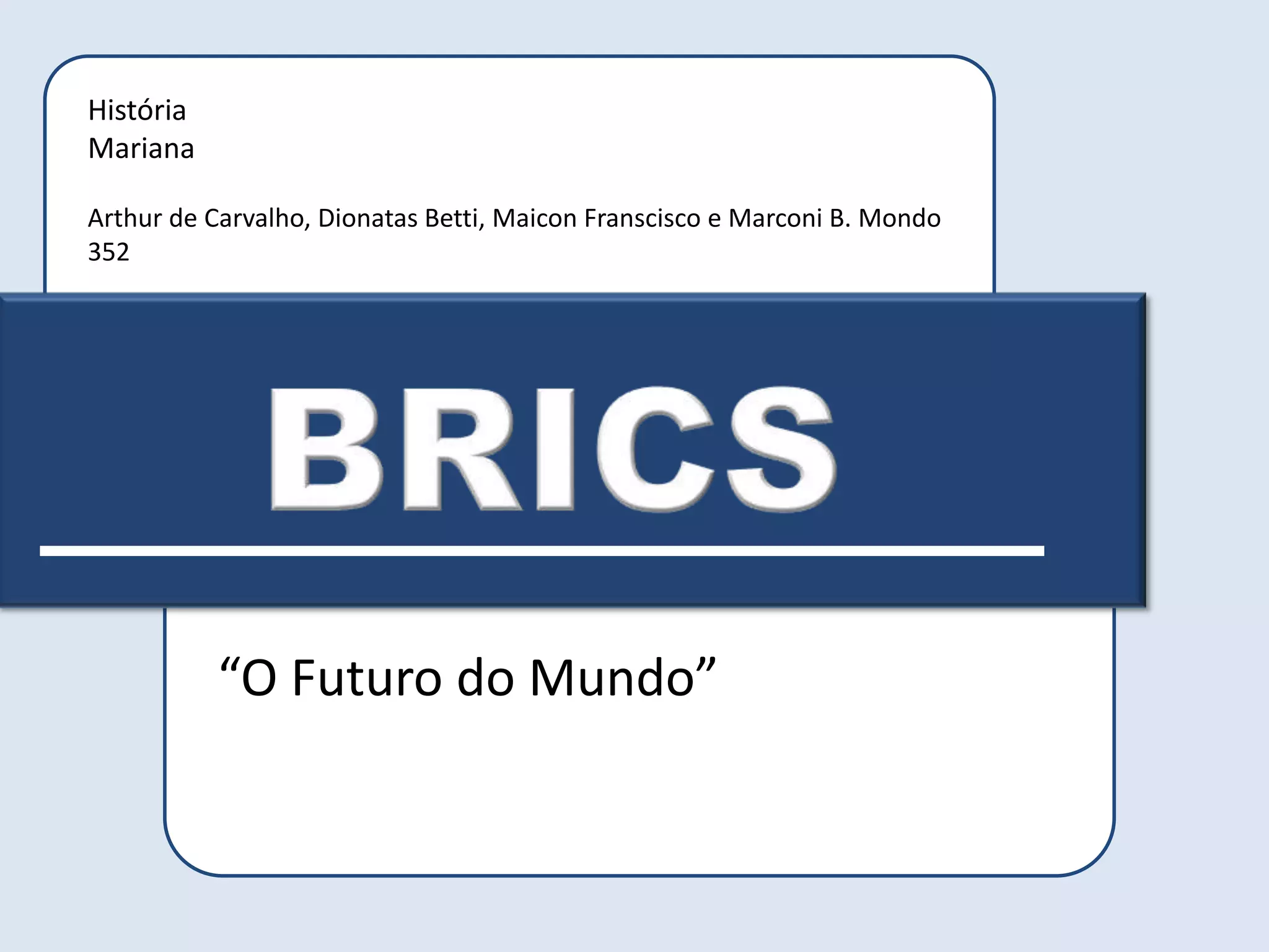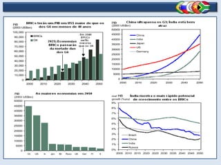O documento discute o termo BRICS, que se refere à combinação de Brasil, Rússia, Índia, China e África do Sul. Apesar de não serem uma aliança política, esses países têm potencial para formar um poderoso bloco econômico. Juntos, eles respondem por 40% da população mundial e um quarto da superfície terrestre.