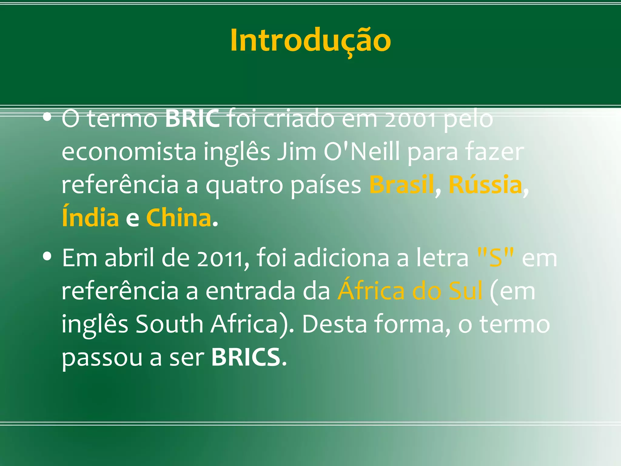 O documento descreve os países do BRICS, incluindo suas características econômicas e sociais. O Brasil, Rússia, Índia, China e África do Sul compartilham crescimento econômico, populações em expansão, e recursos naturais abundantes. A China em particular é destacada como tendo uma das economias que mais crescem no mundo e se tornando uma das maiores economias globais.