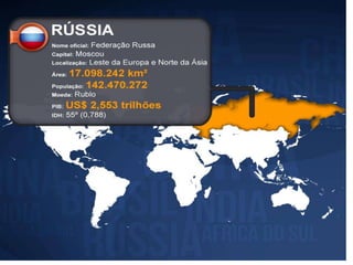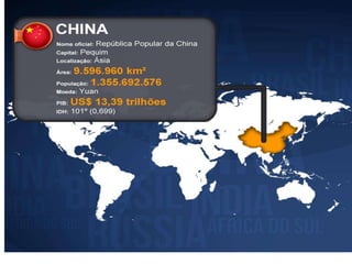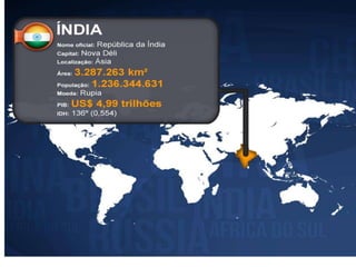 O documento descreve a origem do termo "Brics", criado em 2001 para se referir ao Brasil, Rússia, Índia e China. Em 2006, esses países começaram a se reunir diplomaticamente e formalizaram o grupo. Em 2011, a África do Sul foi adicionada ao grupo, que passou a ser chamado de Brics.