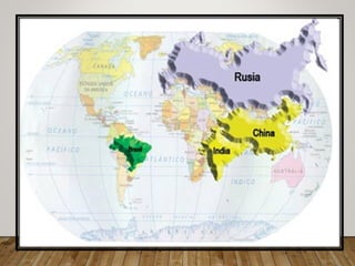 O documento discute o grupo BRICs, formado por Brasil, Rússia, Índia e China. Ele descreve as características comuns desses países em desenvolvimento e projeta que suas economias, juntas, podem superar as economias dos países do G6 até 2050. Também analisa o potencial de cada país e desafios que podem afetar seu crescimento.