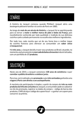 A Jacquet, marca francesa de pães e bolos, comemora 130 anos no Brasil com uma promoção para sortear viagens a Paris. Os consumidores que comprarem três ou mais produtos da linha de cartuchos da Jacquet poderão se cadastrar no site da promoção para concorrer. A promoção ocorrerá de 1o de novembro de 2015 a 29 de fevereiro de 2016, com sorteio em 9 de março, e cada ganhador viajará a Paris por cinco dias com passagem, hospedagem e tour inclusos.
