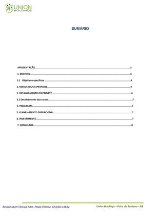 Este documento apresenta uma proposta de curso de capacitação para Operador de Produção e Processos Industriais. O curso tem como objetivos capacitar profissionais com conhecimentos técnicos e comportamentais para atuar na indústria, aumentar a empregabilidade dos participantes e desenvolver uma visão holística dos sistemas industriais. O curso será composto por módulos sobre administração da produção, qualidade, ética, segurança no trabalho, relações industriais e mecânica básica.