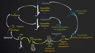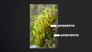 O documento explica as características das briófitas, incluindo que elas apresentam alternância de geração com os gametófitos sendo a fase duradoura e os esporófitos a fase dependente. As briófitas são classificadas em três divisões e compartilham semelhanças com as pteridófitas como a reprodução dependente da água e a ausência de sementes e flores, mas se diferenciam por terem o gametófito como a fase independente.