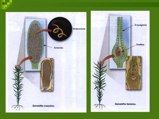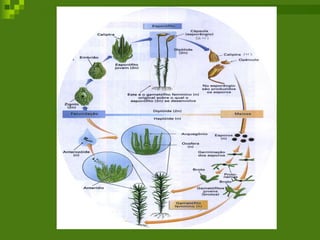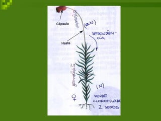 As Briófitas são plantas pequenas, aquáticas ou terrestres úmidas, que não possuem vasos condutores e se reproduzem através da alternância de gerações haplóide e diplóide. Os principais tipos de Briófitas são musgos, que possuem um talo semelhante a um vegetal superior, e hepáticas, com um talo em forma de lâmina delgada. A reprodução ocorre através da formação e fusão de gametas nos gametângios masculinos e femininos durante a geração hapl
