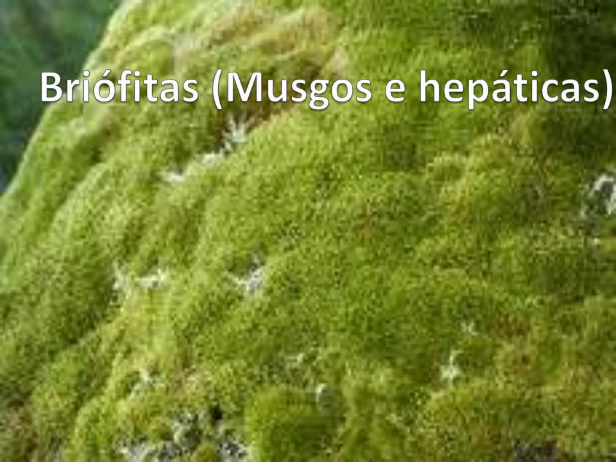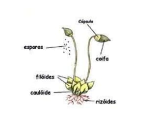 Os briófitas são plantas pequenas que vivem em locais úmidos e incluem musgos e hepáticas. Eles se fixam no solo por rizóides e absorvem água e nutrientes por células individuais devido à falta de vasos condutores. Reproduzem-se sexuadamente quando os gametas masculinos fecundam os femininos, gerando um esporófito que produz esporos e recomeça o ciclo.