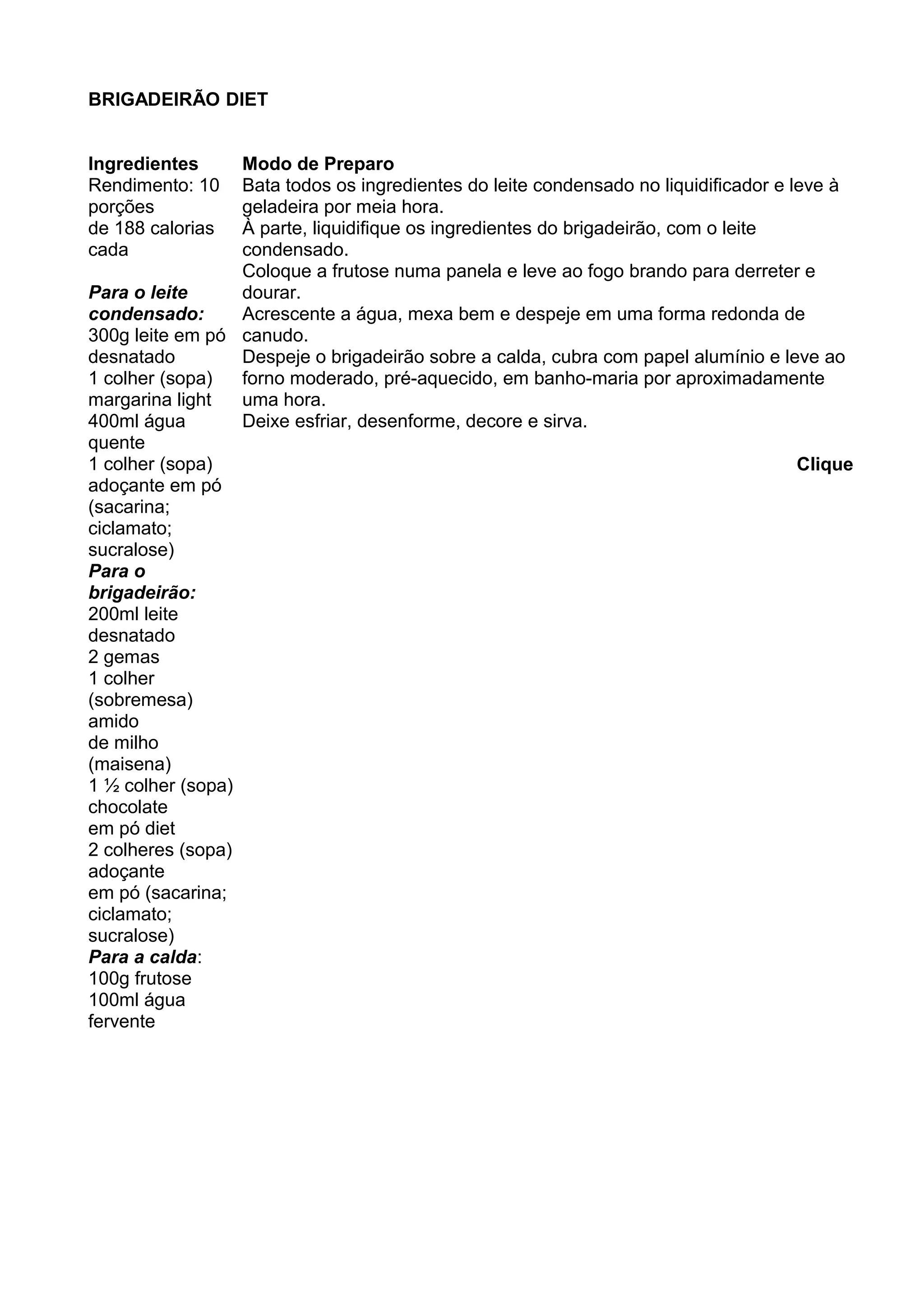 Este documento fornece uma receita de brigadeirão diet com 188 calorias por porção. A receita inclui instruções para preparar o leite condensado, o brigadeirão e a calda de frutose. O brigadeirão é preparado misturando o leite condensado com outros ingredientes como leite desnatado, gemas e chocolate em pó diet. A calda é feita derretendo frutose em água e despejando sobre uma forma. Em seguida, o brigadeirão é despejado sobre a calda e assado em banho-maria.