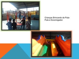 As fotos mostram crianças se divertindo em brinquedos como pula-pula, escorregador e piscina de bolinhas na escola. Todas as crianças estão sorrindo e se divertindo muito nos brinquedos. O documento fornece créditos para as fotos tiradas e a edição do álbum.