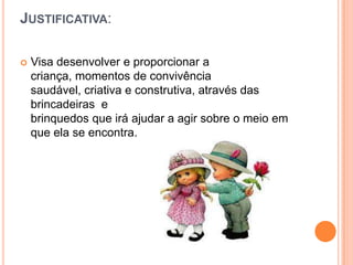 O projeto visa desenvolver momentos de convivência saudável e criativa para crianças de 3-4 anos através de brincadeiras e brinquedos. Serão realizadas atividades como músicas, jogos, confecção de brinquedos e registros das brincadeiras para aumentar o repertório lúdico e favorecer a socialização e o desenvolvimento das crianças. O projeto terá duração de 2 meses e contará com recursos como aparelhos de som, livros e internet.