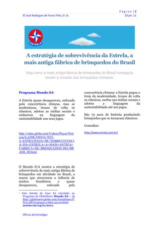 A Estrela, a mais antiga fábrica de brinquedos do Brasil, quase faliu devido à concorrência chinesa barata, mas se modernizou e adotou novas estratégias como lançar produtos sustentáveis e usar mídias sociais para sobreviver no mercado. A empresa também aumentou lançamentos de novos produtos e prevê crescer suas vendas em 15% em 2010.