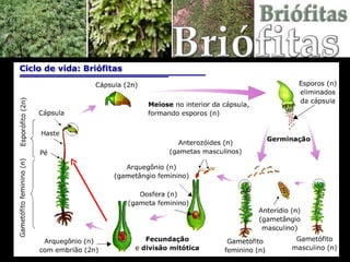 O documento descreve as características gerais e classificação das briófitas, incluindo hepáticas, antóceros e musgos. As briófitas são plantas pequenas que vivem em locais úmidos e são criptógamas e avasculares. Elas são classificadas em três classes com base na estrutura do esporófito. O documento também discute a reprodução, história evolutiva e características distintivas de cada grupo.