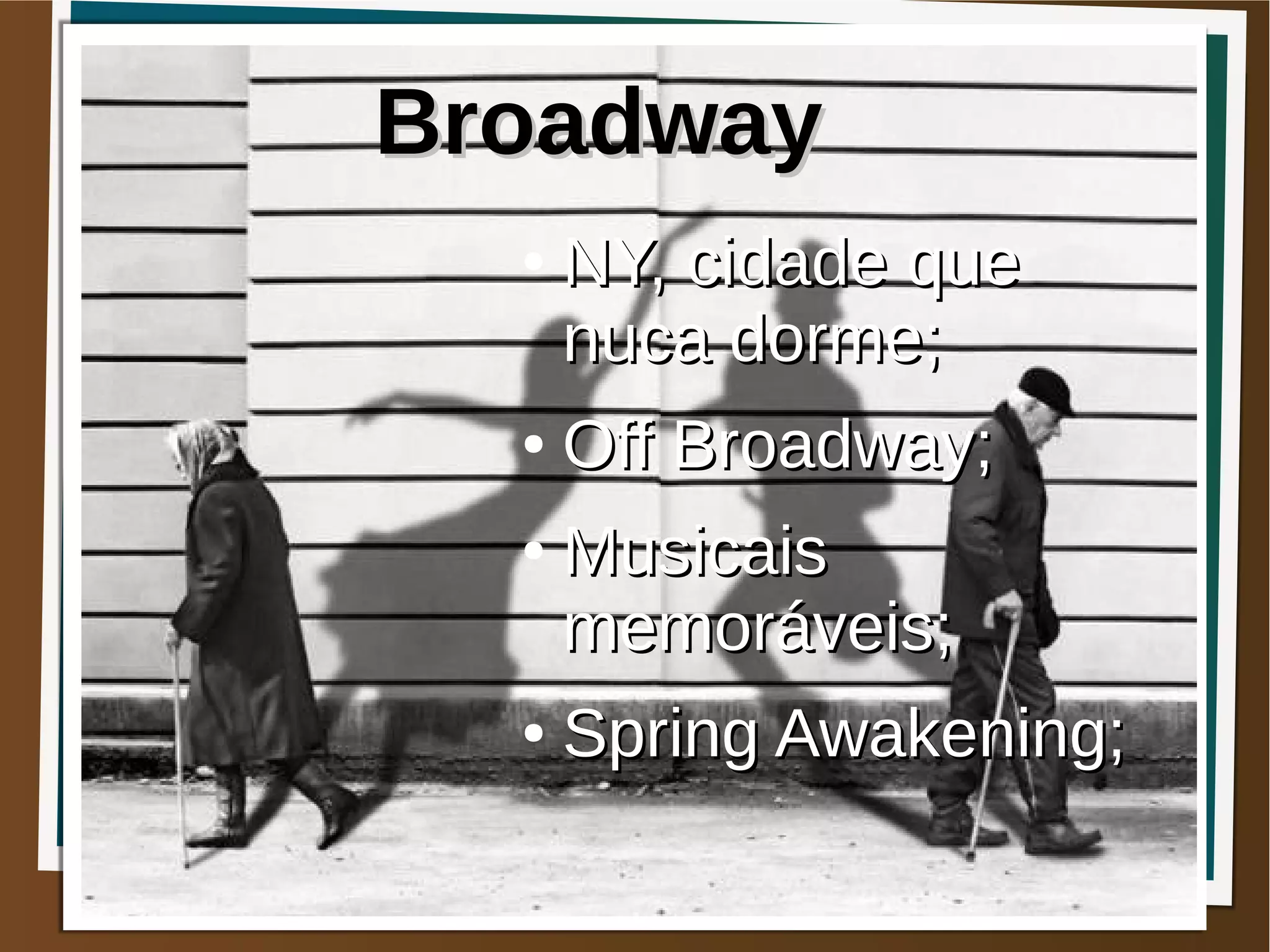 Nova York, a cidade mais populosa dos EUA, é um centro global de comércio, finanças e entretenimento, com atrações notáveis como a Broadway e a Times Square. Broadway é famosa por suas superproduções de musicais, enquanto Off-Broadway apresenta peças em teatros menores. O musical 'Spring Awakening', que aborda temas controversos e foi premiado no Tony Awards, exemplifica a riqueza cultural da cidade.