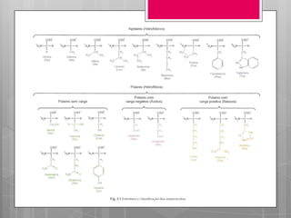 O documento discute a biodisponibilidade de proteínas, incluindo a digestão e absorção de aminoácidos, bem como o metabolismo e funções dos aminoácidos no corpo. Fatores como a estrutura da proteína, fatores antinutricionais e processamento podem afetar a digestibilidade das proteínas. A avaliação da qualidade nutricional das proteínas deve considerar a capacidade de fornecer aminoácidos essenciais.