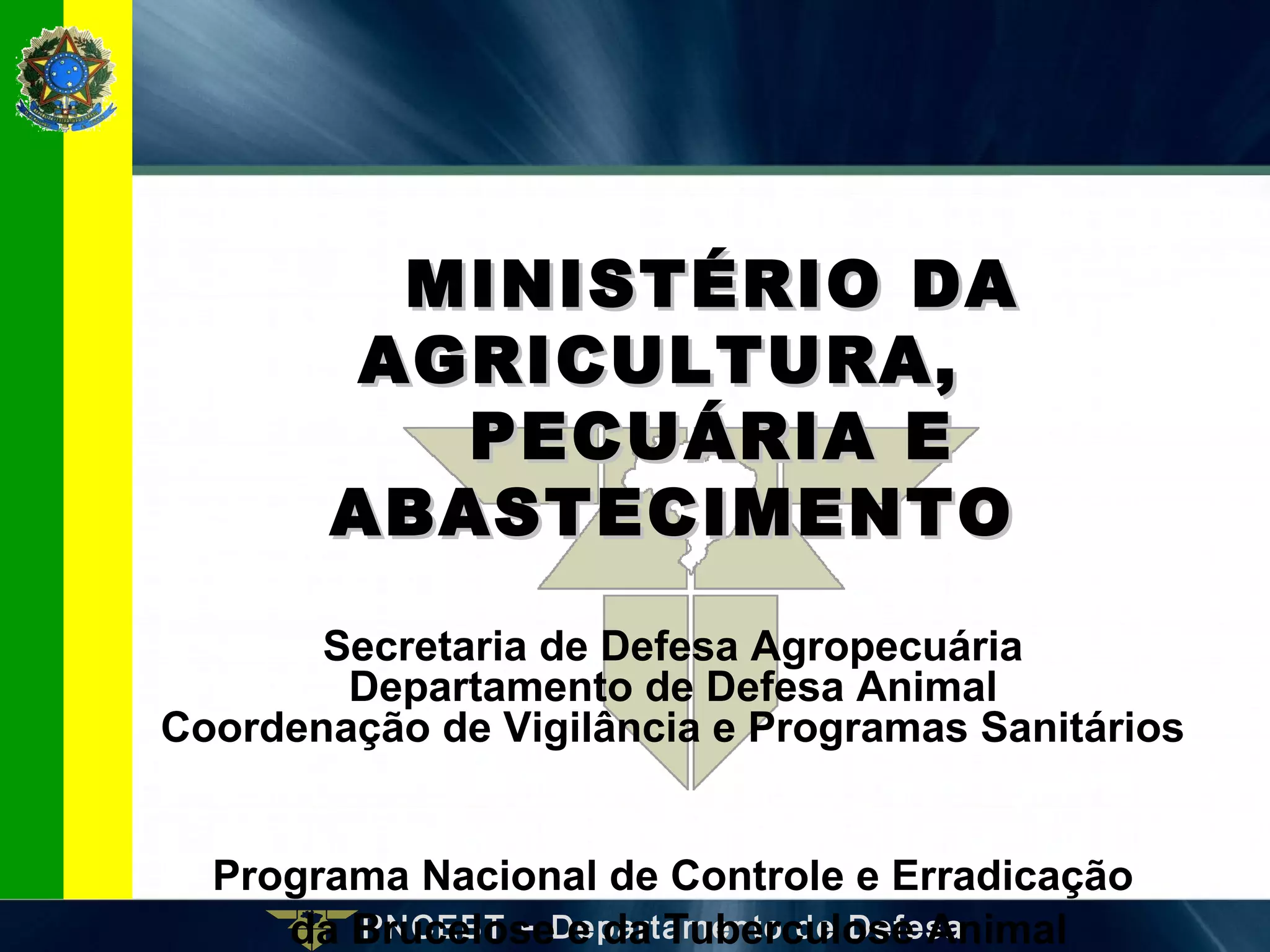 O documento descreve o Programa Nacional de Controle e Erradicação da Brucelose e da Tuberculose Animal (PNCEBT) no Brasil, fornecendo informações sobre a brucelose bovina, incluindo sua definição, agente causador, epidemiologia, transmissão, sinais clínicos, diagnóstico e controle.