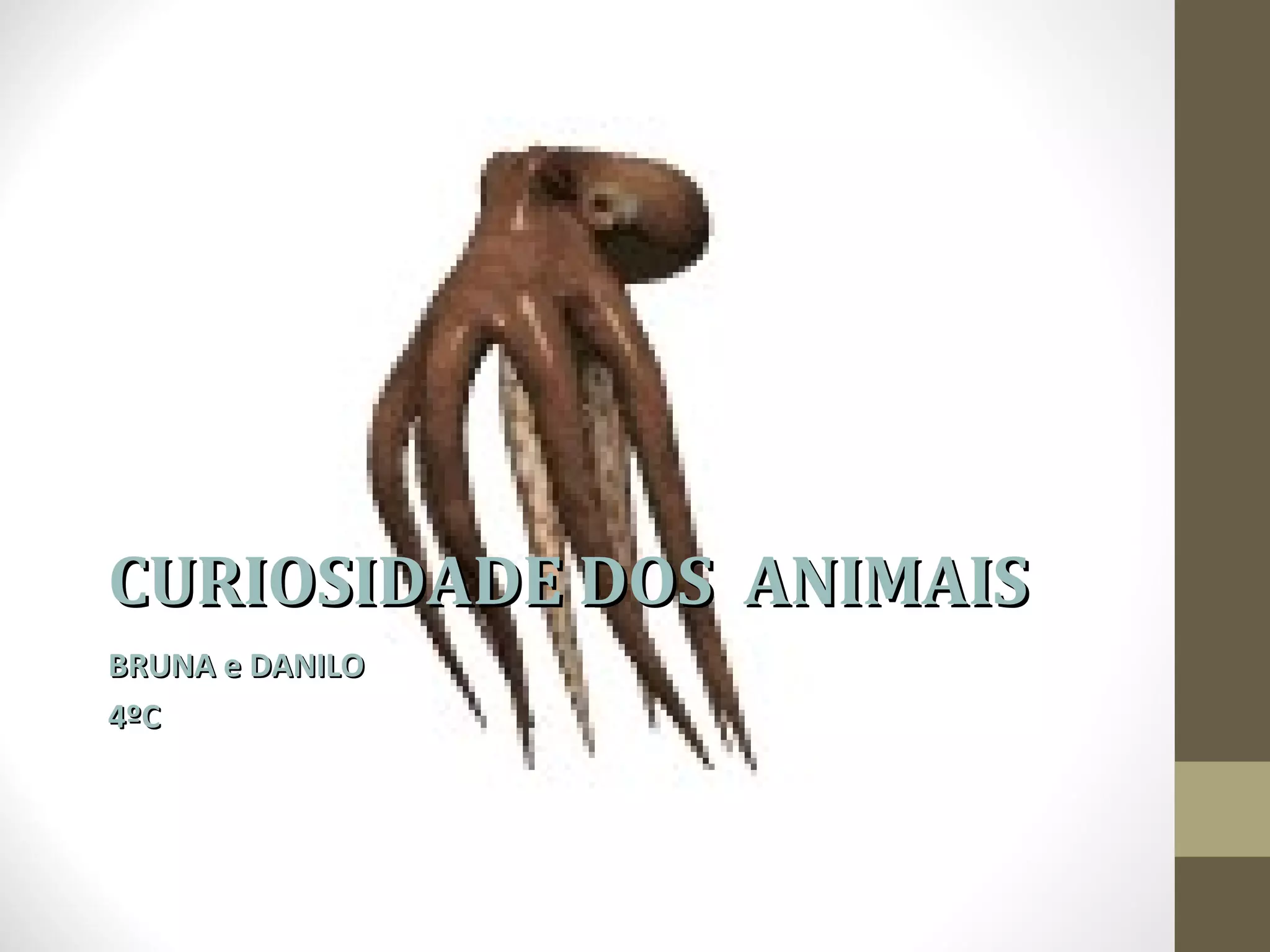 Este documento discute animais invertebrados e polvos. Ele explica que animais invertebrados não têm coluna vertebral ou crânio e incluem esponjas, águas-vivas, vermes, minhocas e formigas. O documento então fornece detalhes sobre o habitat, alimentação e diferenças entre machos e fêmeas de polvos, notando que eles vivem no oceano, comem peixes e crustáceos, e os machos têm um órgão reprodutivo especial em um de seus tentáculos.