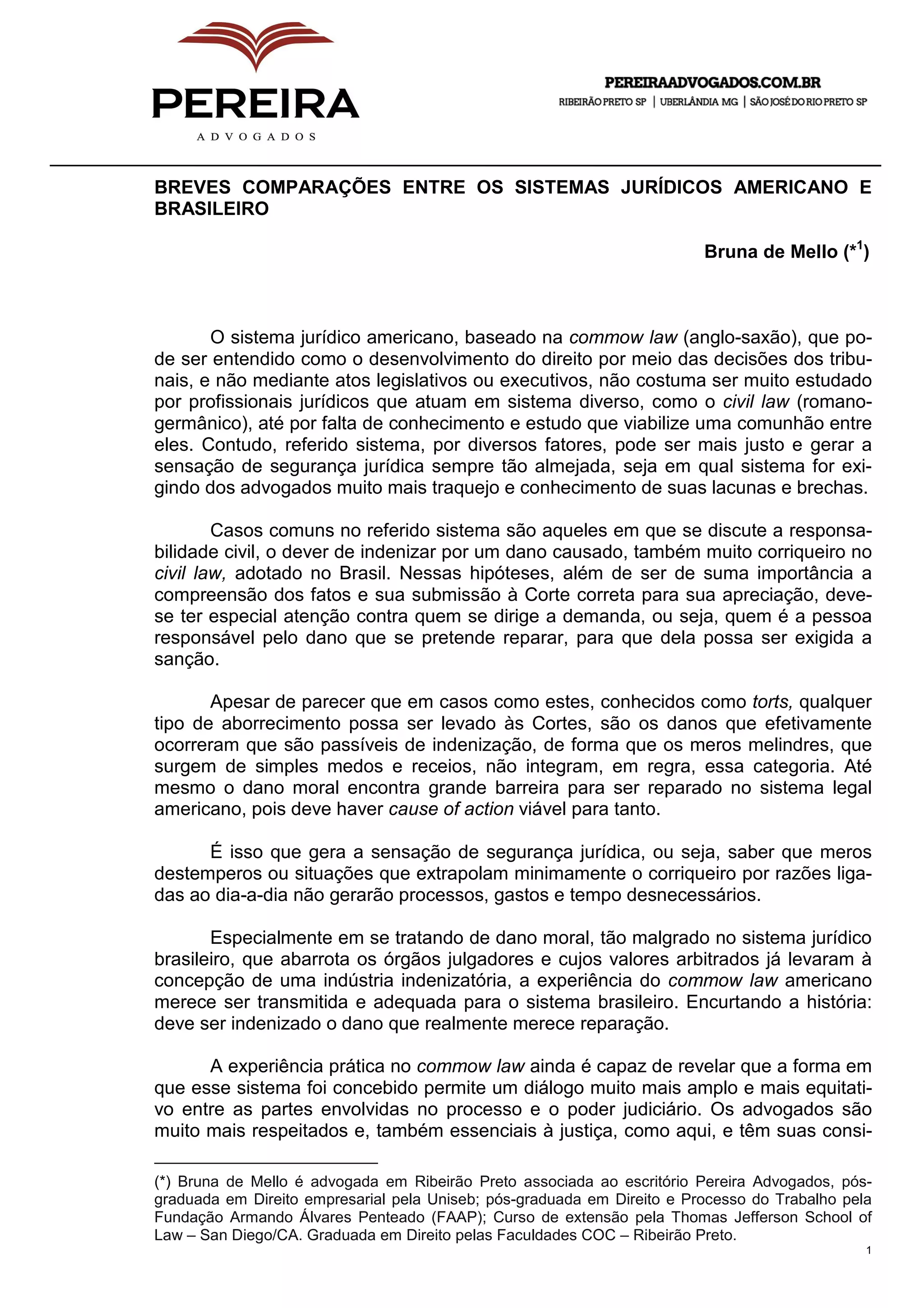 1) O sistema jurídico americano baseado na common law difere do sistema civil law brasileiro, mas ambos lidam com casos de responsabilidade civil e dano moral.